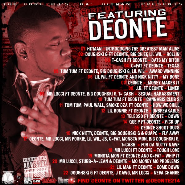 Deonte and Da' Hitman had teamed up previously on Deonte's "Grown Man Shit" mixtape back in September of 2010 (GROWN MAN SHIT), but the growth of both the artist and the DJ since that time has been leaps and bounds. Now Da' Hitman returns with Deonte to release Deonte's mixtape "FEAUTRING DEONTE" which includes a Dallas "Who's Who" list of talent: Doughski G, Big Chief, Lil Wil, T-Cash, C-Fat, Tum Tum, Big Doughski G, Nick Nitty, J.B., Mr Lucci, Paul Wall, Smoke Dza, Lil Ronnie, Teleoso, Que P, Guapo, Mr Pookie, Monsta Mon, Stubb-a-Lean, Lil Man, and J Dawg.